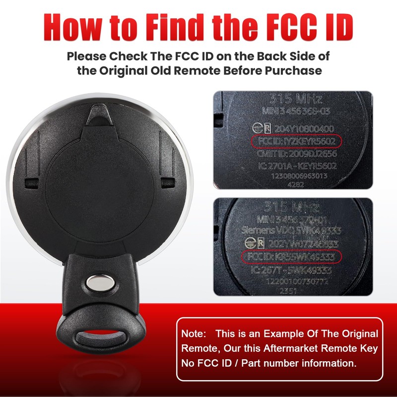• Compatibility: Compatible with FCC ID: IYZKEYR5602 or KR55WK49333. NOTE: FCC ID match with original. Please check the FCC ID and Part number on the front of the original old remote before purchase