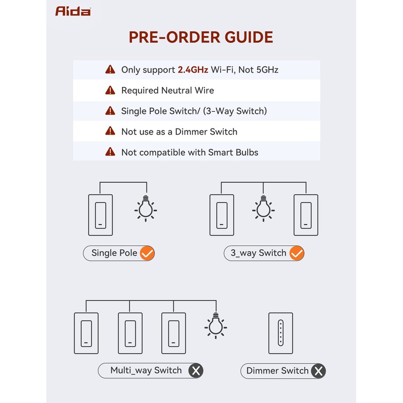 - 【Timer and schedules】With AIDA smart light switches you can use schedules or countdown timer to set your lights to automatically turn on and off at the time you want. Sync on and off times to sunrise and sunset. Bed lights will wake you up in the morning and porch lights will greet you when you come home late.