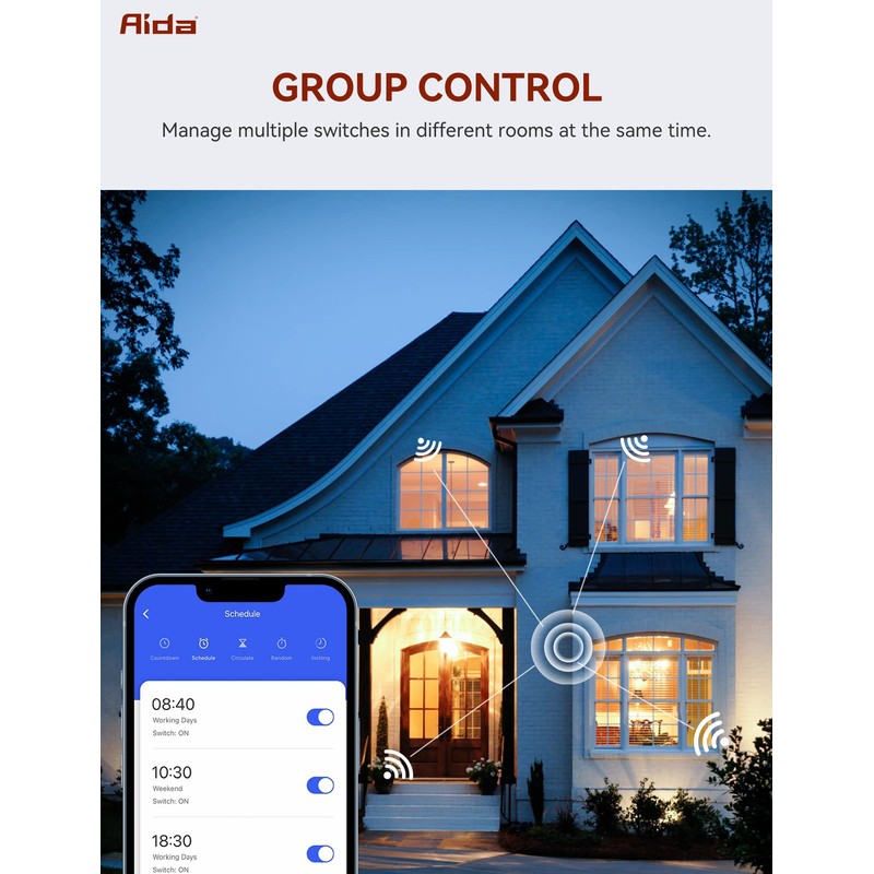 - 【Timer and schedules】With AIDA smart light switches you can use schedules or countdown timer to set your lights to automatically turn on and off at the time you want. Sync on and off times to sunrise and sunset. Bed lights will wake you up in the morning and porch lights will greet you when you come home late.