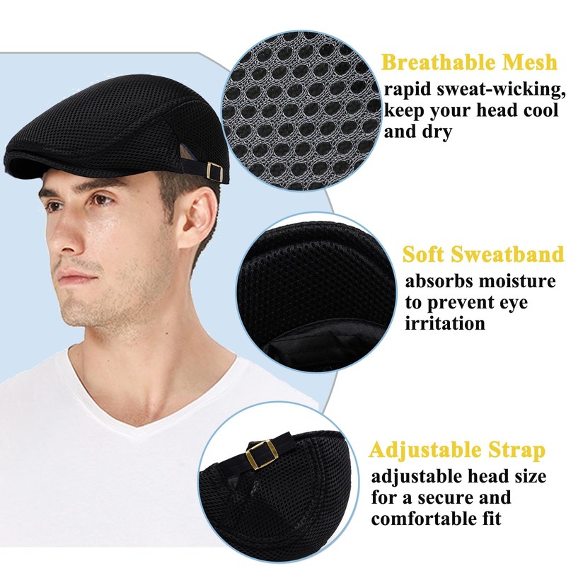 - Breathable Mesh Design: Crafted with premium full mesh fabric for all-around airflow and rapid sweat-wicking, keeping your head cool and dry. The built-in soft sweatband absorbs moisture to prevent eye irritation, and relieve the friction between the adjustable beret ivy cap and the scalp—ideal for staying fresh during summer outdoor activities.