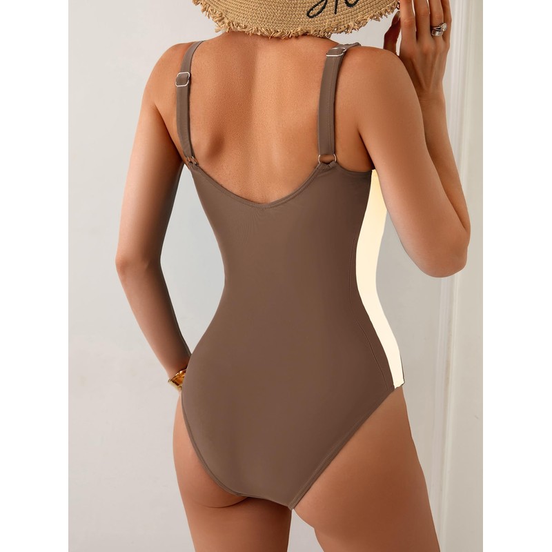 Aidonger Women's One Piece Swimsuits Tummy Control Bathing Suit Color Block Slimming Swimwear Ruched Swim Suit, Brown and Beige, X-Large