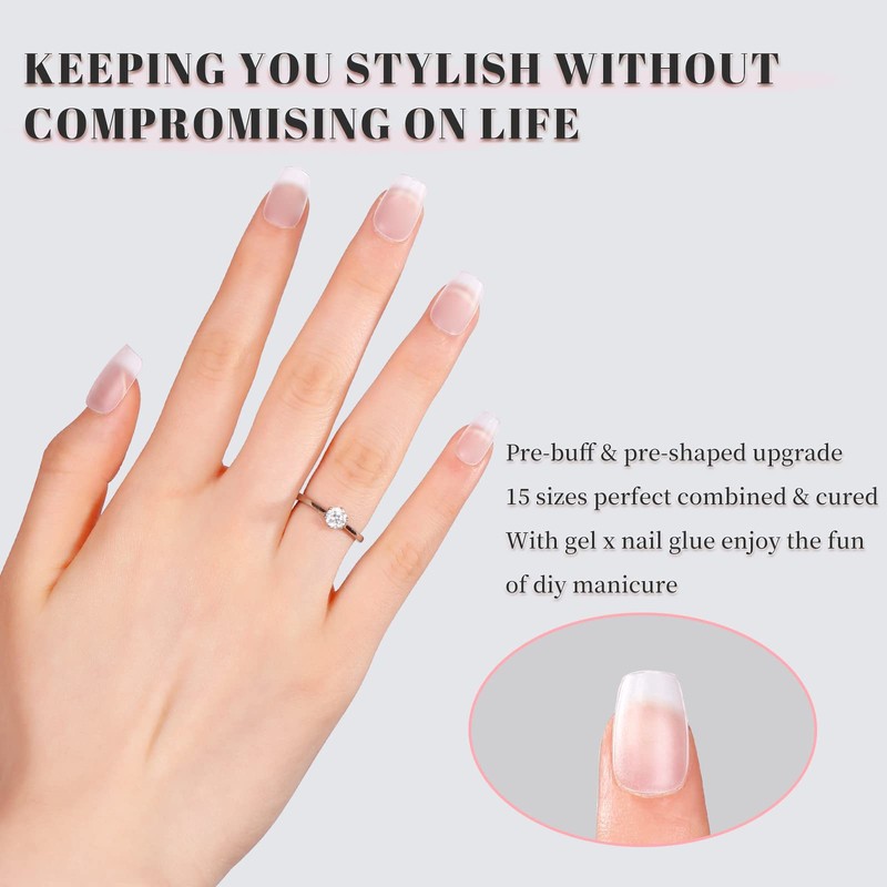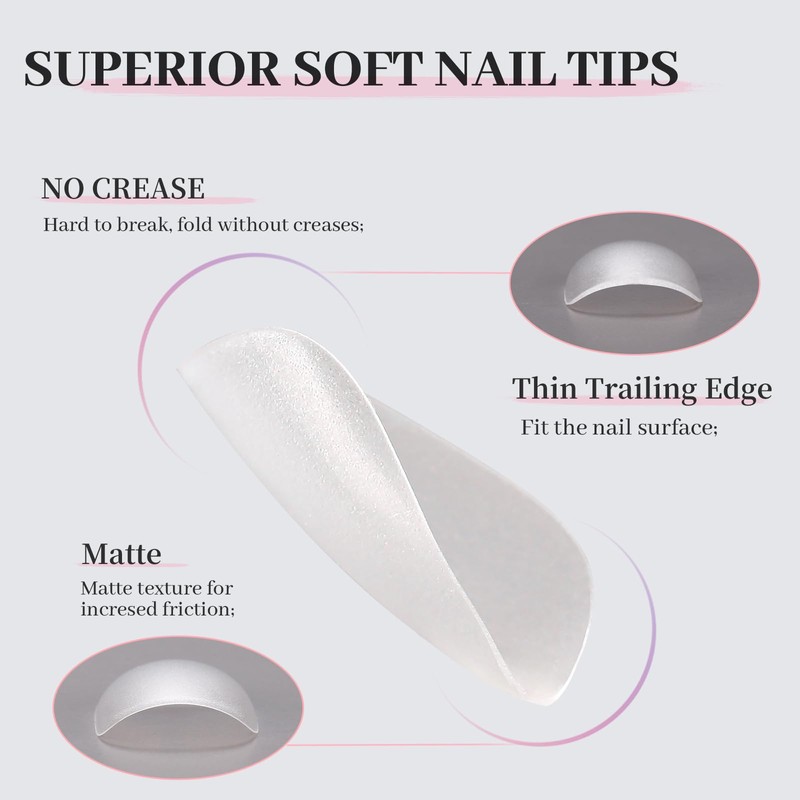- EASY TO APPLY GEL NAILS No primer and file needed, the upgraded version of soft nails has different matte textures on both sides, no primer required, it has stronger adhesion, achieves the effect of strengthening the nails, protect the nails from more wear and tear, directly apply nail polish or other products that are perfect for your natural nails, saving time, effort and money.