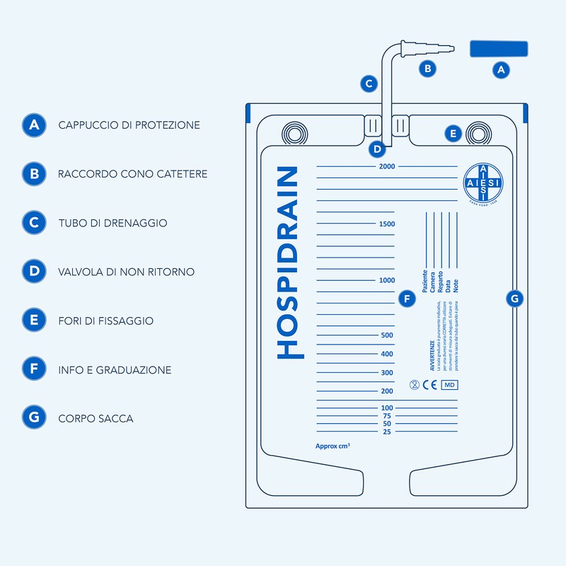 - HOSPIDRAIN thermo-welded bags made of non-toxic flexible PVC that meet the requirements of European standards in terms of biocompatibility of the EN30993 series
