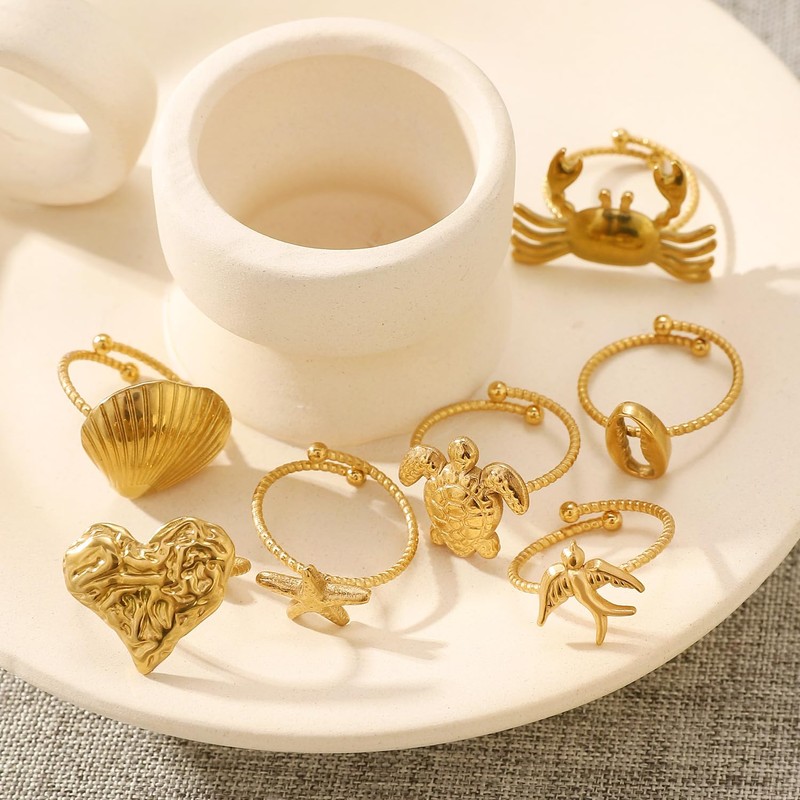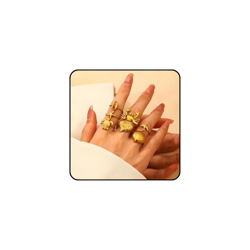 - 【Gold Starfish & Shell Ring Set】:This ring set embodies ocean romance, with the shell symbolizing the sea’s gentle embrace and the starfish representing hope and luck. Perfect for nature and beach lovers, it adds a touch of freedom and vibrancy to your style