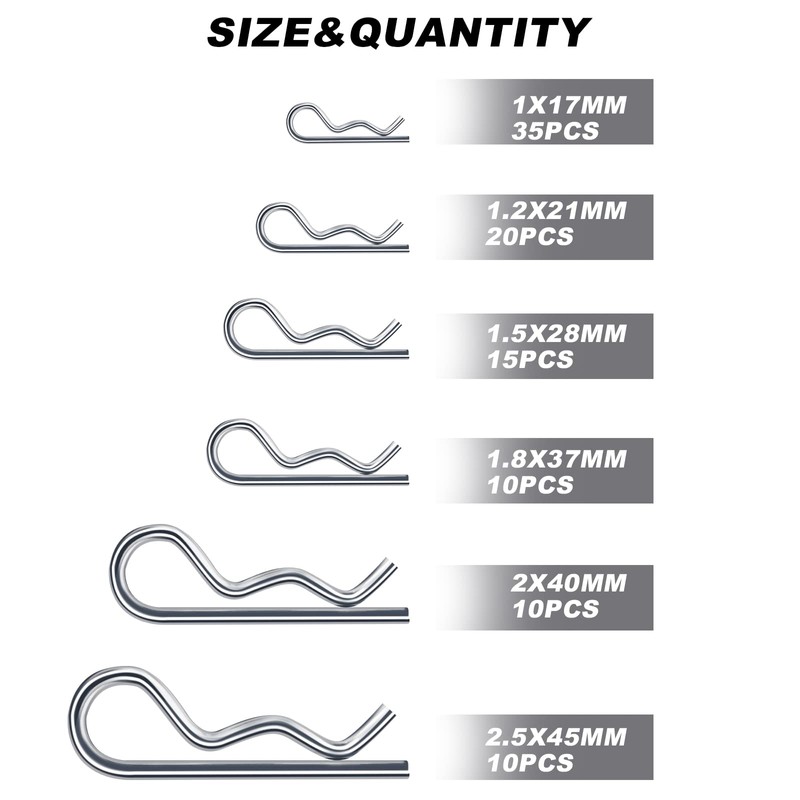 - Product Size: This cotter pins assortment kit includes 6 sizes: 35pcs 1x17mm, 20pcs 1.2x21mm, 15pcs 1.5x28mm, 10pcs 1.8x37mm, 10pcs 2x40mm, 10pcs 2.5x45mm, different sizes can meet your different daily needs.