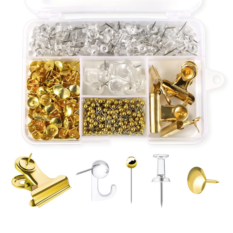 AIEX 465pcs Clear Push Pins Set, Metal & Plastic Pushpins Clips Thumb Tacks and Push Pins for Cork Board Bulletin Board Wall 5 Styles Office Supplies (Gold)
