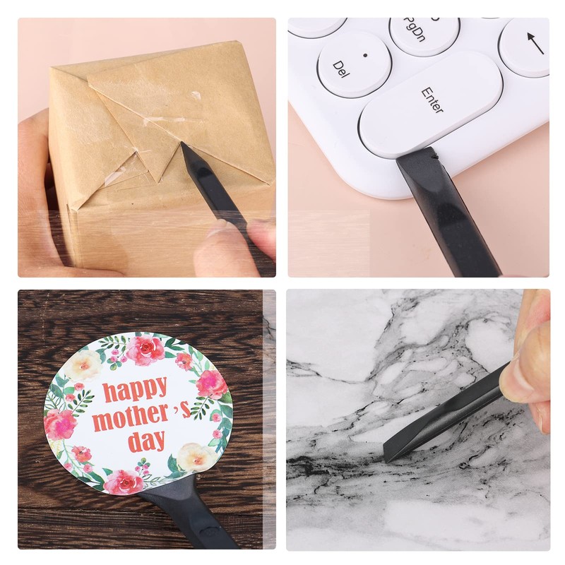 - Enduring Material: The stiff multi-purpose label scraper is made of high quality carbon fiber plastic, enduring and not easy to break under pressure. The scratch free plastic scraper also features high hardness, light weight, all making it reusable and easy to carry. The scraping cleaning tools do a good job and protect your nails.