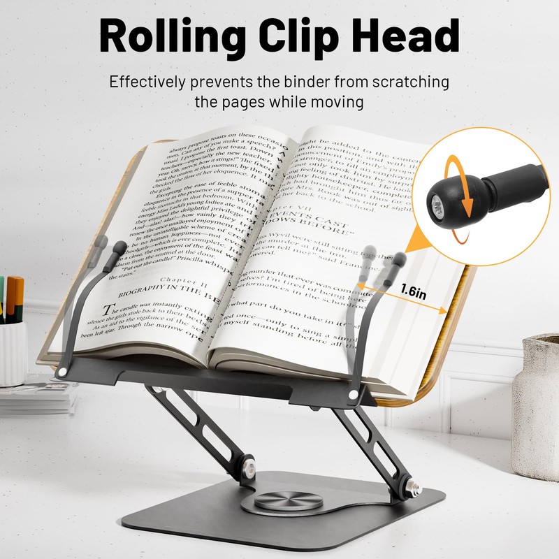 - Book Clip for Hands-Free Reading:This cookbook stand designed with elastic page clips to keep your book's pages from flipping or moving while reading, also help to release your hands from controlling the books, enhance your reading experience. And the head of clip is rotatable, it will rotate as the clip moves, effectively prevents the page clip head from scratching the pages while moving
