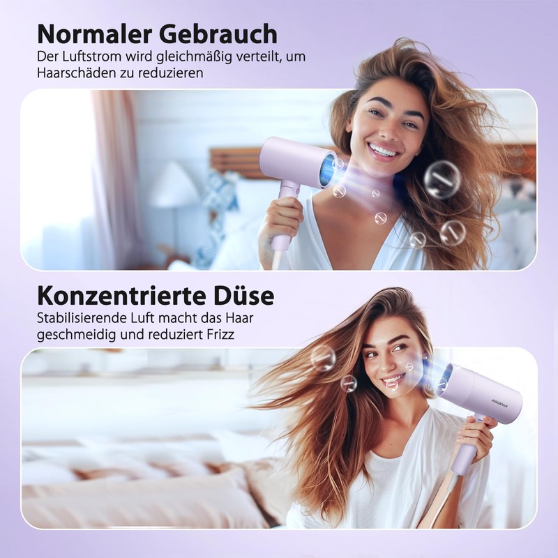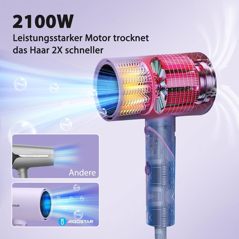 Aigostar Travel Home Dryer - 2100W Ion Technology, 3 Temperatures / 2 Speeds, Overheating Protection, Purple with Storage Bag