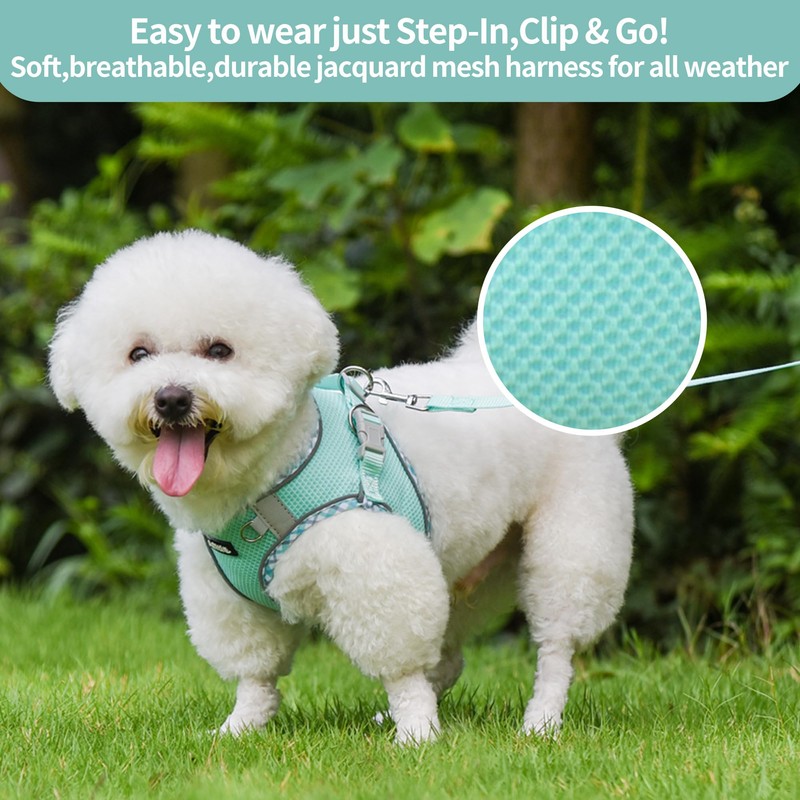 Why choose AIITLE step-in dog harness and leash set? Comfortable and Soft: Made of Jacquard fabric, flexible, light, breathable, three-dimensional and soft, pets can feel more comfortable, and suitable for all season weather, even hot summer. Thoughtful Design: One dog vest harness with one leash, a practical walking set! Reflective: With 360-degree Reflective strip design, your pet can be visible at night, safer and more easy control. Step-In Design: Just step in, stick the magic tape, clip and go, simple and easy. Durable: Made of superior material, can last long. Escape-Proof: Designed with a combination of magic tape and double D-rings buckle, ensuring that your dog will not easily escape. Easy To Wear: The step-in design is easy to put on and off, effortlessly slip this easy-to-wear vest harness on and off your puppy in seconds. We have 6 sizes to choose, perfect for small dogs, cats, puppies and kittens. Warm Tips:Please measure your pet's neck girth and the fullest part of the chest, just behind the front legs, and refer to our size chart to choose the suitable one. Ultimate Comfort The padded design reduces tugging and pulling on your pup's neck while the breathable mesh fabric dries quickly and is ideal for all types of weather. Triple Security The triple security features double stitched fabric, strong magic tape closure, and heavy duty metal D-rings that make for a secure leash attachment! The magic tape closure makes fitment easy and fully adjustable. Fully Adjustable for a Great Fit This step in harness was designed to encompass most sizes and breeds of dogs. Buy with confidence and be completely satisfied! If you're not, rest assured our team at AIITLE Pet Supply will help you make it right. Specifications: -Material: Metal/Jacquard -Color: Black/Blue/Orange/Pink/Purple/Purple-White/Sage/Turquoise/Turquoise-Pink Package Included: -1 x leash -1 x harness