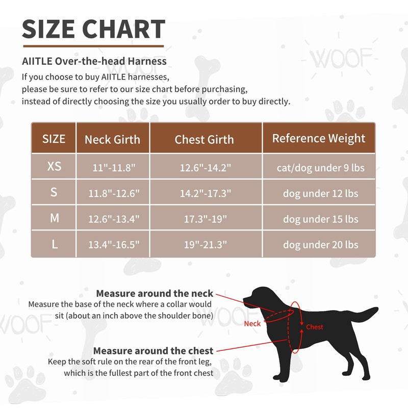 - DAILY HARNESS & LEASH SET - AIITLE Dog Harness Set includes Dog Harness + Dog Leash. Sizing does You can refer to Our Size Guide and sizing chart for the best fit. If in between sizes, please order one size up. AIITLE Dog Harness include the sizes from XXS-L for Small Medium breed up to 38 lbs, such as Boston Terrier, Maltese, Pekingese, Shih Tzu, Chihuahua, Poodle, Papillon, Teddy, Schnauzer and so on.