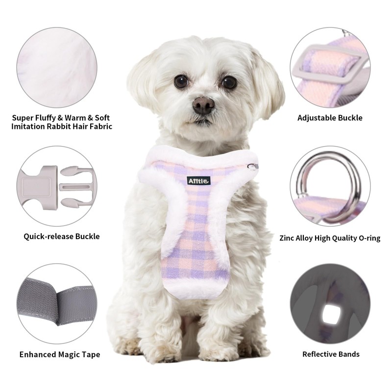 AIITLE Reflective Plush Dog Winter Harness and Leash Set - Breathable Plaid Dog Vest Warm Dog Harness - Fleece Lined Dog Vest for Cold Weather, Easy to Put on Small and Medium Dogs Purple S