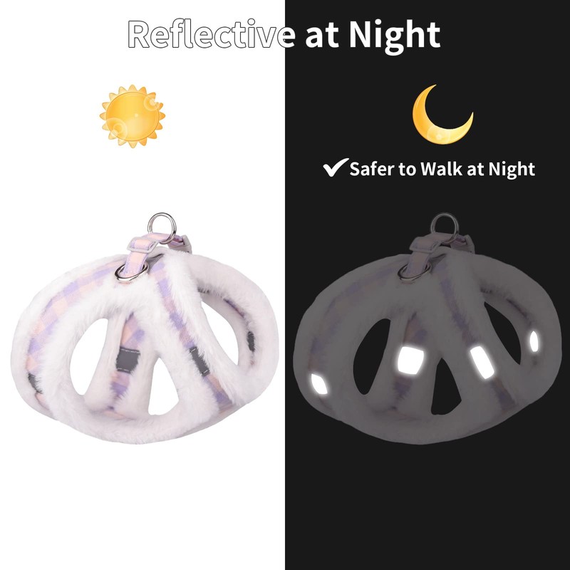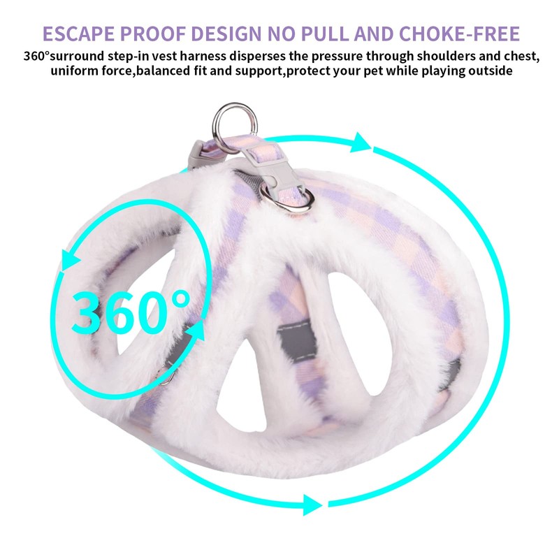 • WARM PLUSH & SAFE - Made with soft imitation rabbit hair, super fluffy, warm and more comfortable, this lightweight pet harness is perfect for walks in autumn and winter. The vest-style design disperses the pressure through shoulders and chest, uniform force, no need to worry about the danger of suffocation or choking.Our hook and loop fastener, buckle and D-rings work together protect your pet in triple security.