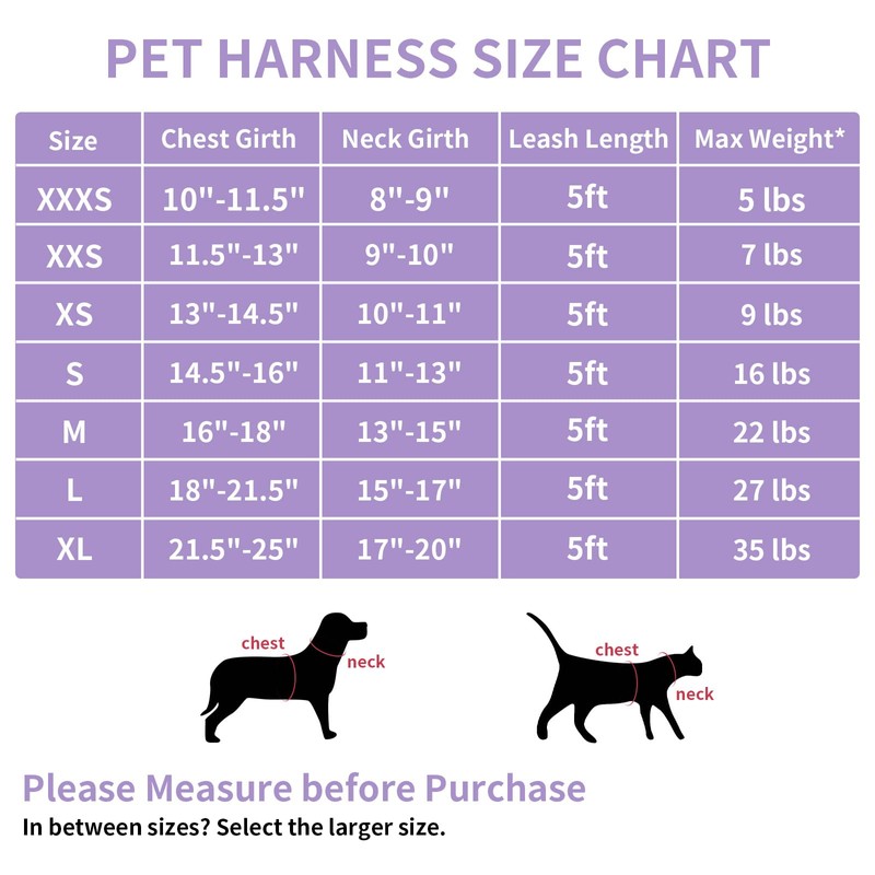 Features: 1. Adjustable harness and quick-release buckle 2. Classic Plaid Pattern 3. Easy to put on and take off 4. Easy to clean, Machine Washable 5. Lined with fleece on the inside to provide warmth for your pet. 6. Light weight but tough enough 7. Skin-friendly, soft,warm,comfortable and well made 8. Durable alloy O-ring for leash attachment 9. Beautiful choice of colors to suit your pets personality. 10. Cold weather use Please refer to our Size Chart before buying: [SIZE]: XXXS Chest Girth: 10" - 11.5" ,Neck Girth: 8"-9". Leash width:0.39"(1.0cm),Leash length:59" (150cm). Fit weight Under 5 Pounds. [SIZE]: XXS Chest Girth: 11.5" - 13" ,Neck Girth: 9"-10" .Leash width:0.39"(1.0cm),Leash length:59" (150cm). Fit weight 5 - 7 Pounds. [SIZE]: XS Chest Girth: 13" - 14.5" ,Neck Girth: 10"-11" .Leash width:0.39"(1.0cm),Leash length:59" (150cm). Fit weight 7 - 9 Pounds. [SIZE]: S Chest Girth: 14.5" - 16" ,Neck Girth: 11"-13" .Leash width:0.39"(1.0cm),Leash length:59" (150cm). Fit weight 9 - 16 Pounds. [SIZE]: M Chest Girth: 16" - 18" ,Neck Girth: 13"-15" .Leash width:0.59""(1.5cm),Leash length:59" (150cm). Fit weight 16 - 22 Pounds. [SIZE]: L Chest Girth: 18" - 21.5" ,Neck Girth: 15"-17" .Leash width:0.59""(1.0cm),Leash length:59" (150cm). Fit weight 22 - 27 Pounds. [SIZE]: XL Chest Girth: 21.5" - 25" ,Neck Girth: 17"-20" .Leash width:0.59""(1.5cm),Leash length:59" (150cm). Fit weight 27 - 35 Pounds. Tips: - Very Important to Measure Before Buying. -Your pet usually wears size S, but it doesn't mean all size S will fit him/her. -If any of the measurements are between two sizes, choose the larger size. - Buy with confidence and be completely satisfied! If you're not, rest assured our team at AIITLE Pet Supply will help you make it right. Make your life easier today with this easy step in harness and leash set and Walk Your Pup in Confidence!