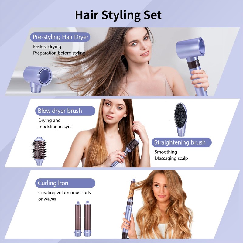 - 5 in 1 VERSATILE STYLING SET: AIKO PRO 5 in 1 Multifunctional AIR STYLING SET, featuring a hair dryer, left & right rotating curling irons, hair dryer brushes, and a hair straightener, effortlessly catering to all your styling needs