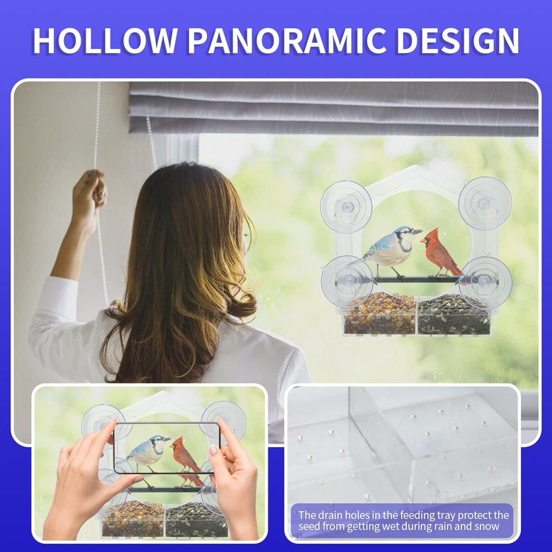 - [Best See-Through Window Bird Feeder] Large viewing window, made from the high quality transparent acrylic, It will not distract other views on the window, when you relax and look out, the garden in the distance is still clearly visible.