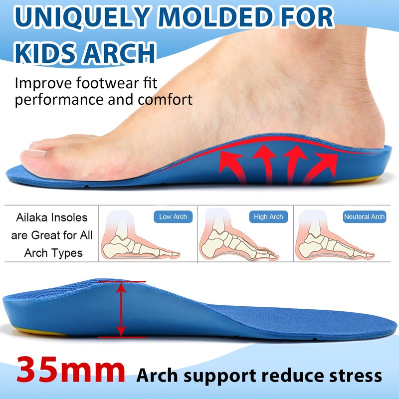 - Orthotic arch support: the fixed arch support orthopaedic insoles children of 3.5 cm height relieves foot fatigue due to flat feet, overpronation, high arch, low arch, frequent foot pain, arch fatigue, plantar fasciitis. The Ailaka medium hard insole for children helps correct flat feet and low arches and avoid potentially serious foot problems.