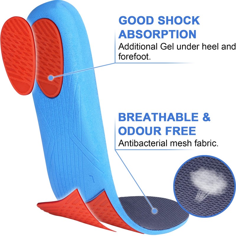 - Súper absorción de golpes: las plantillas elásticas de poliuretano con almohadilla de gel debajo del talón y el antepié están diseñadas específicamente para absorber completamente los golpes y reducir el estrés en los pies con cada paso. Es adecuado para ejercicios de alta intensidad y ayuda a reducir la fatiga inducida por el ejercicio, como espinillas, rodilla del corredor, fascitis plantar.
