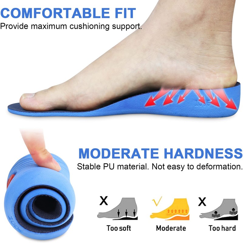 - Deportes, trabajo y ocio: los insertos de elevación de zapatos son perfectos para mejorar el rendimiento y reducir la fatiga en la vida cotidiana. Buen efecto de amortiguación puede reducir el impacto en las articulaciones y los músculos, aliviando los dolores causados por discrepancias de longitud de las piernas.