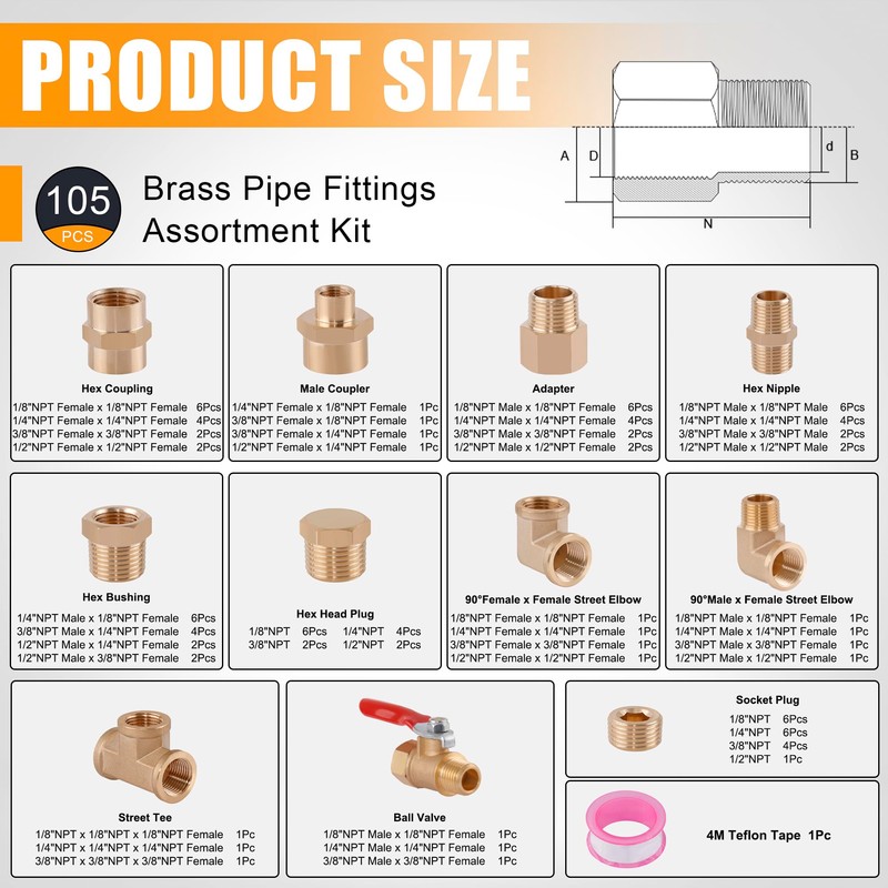 - VALUE PACK: This brass pipe fittings includes 105pcs:14pcs reducing adapter;14pcs male hex nipple;14pcs hex bushing;14pcs hex head plug;17pcs socket plug,14pcs female coupling;4pcs reducing coupling;4pcs 90 degree male x female street elbow;4pcs 90 degree female x female street elbow;3pcs street tee,3pcs ball valve,1pc teflon tape
