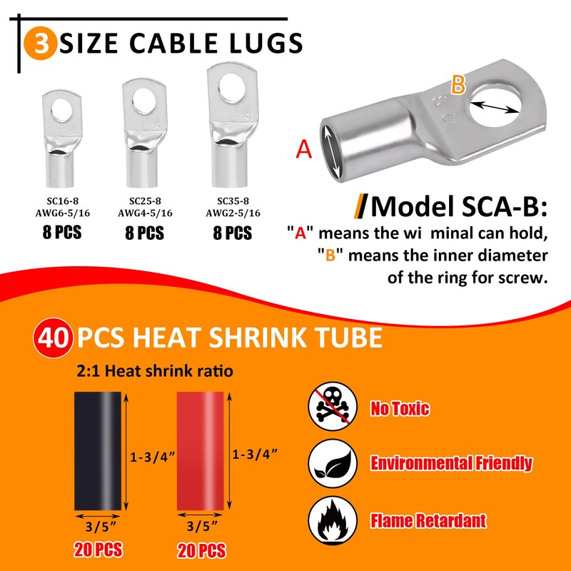 - What You Get: 2Pcs 300A M8 Red Bus Bar(1Pc Red & 1Pc Red Black),24 Pcs per pack of (AWG) 5/16" Cable Lugs with 40 Pcs 2:1 Dual Wall Adhesive Heat Shrink Tubing Tube for your work(20pcs Black & 20pcs Red)