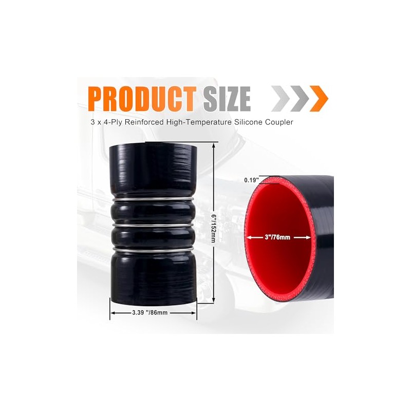 - SPECIFICATIONS: Made of high-temperature 4-ply Aramid Reinforced Silicone, which is UV- and ozone-resistant. Hose Inside Diameter: 3" (76.2mm), Hose Outside Diameter: 3- 1/4" (81.5mm), Hose Length: 6" (152.4mm), Wall Thickness: 0.19' (5 mm), Number of Rings: 3, Temperature Range: -40 F to +392 F, Max Pressure: 100 psi