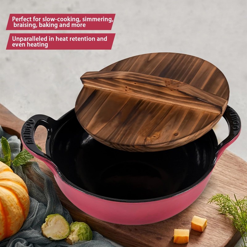 - Beautiful Wooden Lid: The dutch oven cast iron comes with an exquisite wooden lid, adding a touch of rustic charm to your kitchen. The snug fit of the lid keeps the moisture and flavors locked in, guaranteeing tender and flavorful results with every dish.