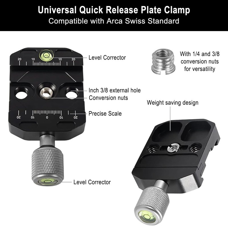 Using the CNC precision machining process, a universal Arca Swiss clamp adapter QR-50 has been designed that can be securely attached to ball heads, mounts, tripods and other camera accessories.