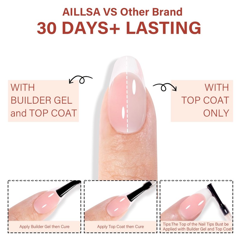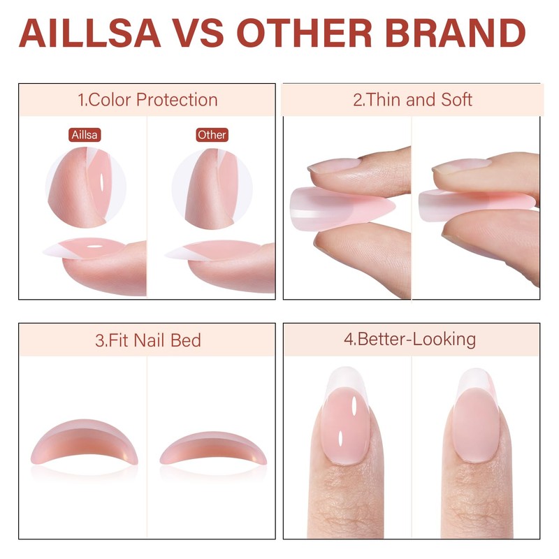 - 【Easy To Use】Aillsa gel nail tips are pre-shaped and do not need to be shaped.The front edge is thickened makes it not easy to break or bend, and lasts more than 3 weeks. The thinner back edge can make the full nail tips fit your nails better and comfortable to wear.