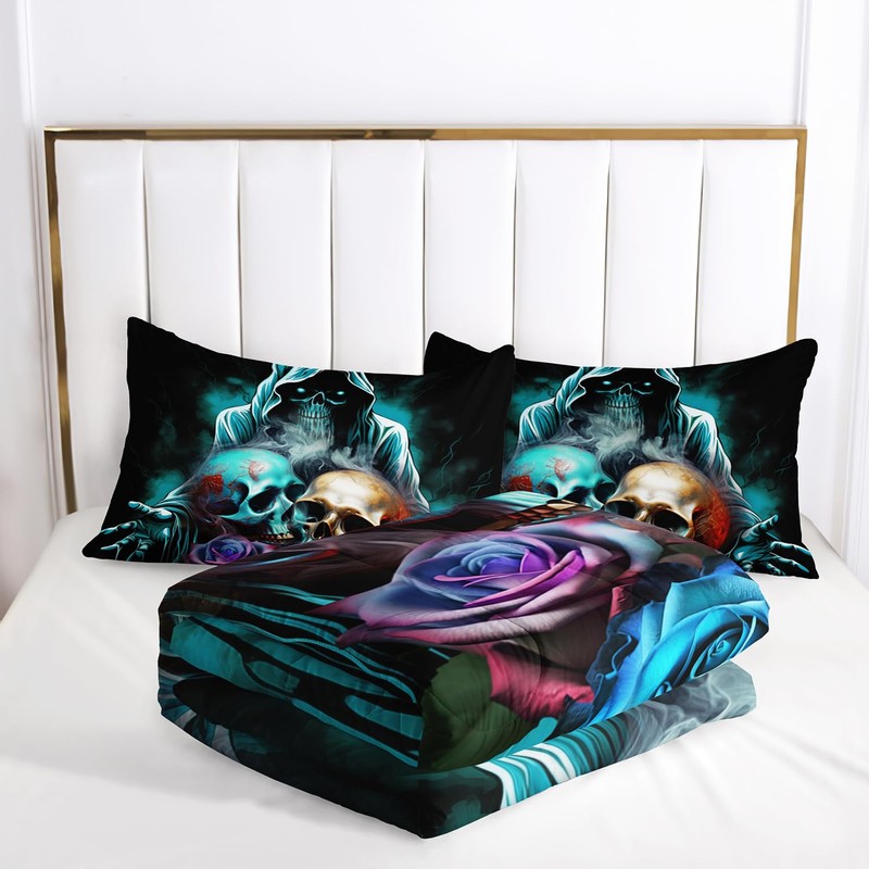 AILONEN 3D Skull Comforter Set Full Size, Boho Reaper Grim with Skeleton Bedding Set for Girls,Women,Oil Rose Duvet Set,3-Piece,1 Quilt + 2 Pillowcases,Soft Microfibre,All Season