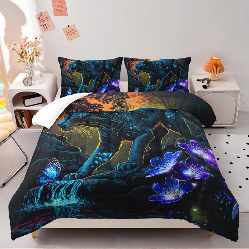 AILONEN Black Panther Comforter Set Twin Size,Glowing Panther Print Bedding Set for Kids Boys Men,3-Piece Wildlife Forest Cheetah Leopard Duvet Set,1 Comforter with 2 Pillowcases