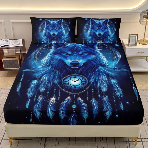 AILONEN Boys Wolf Fitted Sheet Set Twin XL Size,Blue Black Starry Wolf Dreamcatcher Soft Bed Sheet Set 3 Pieces- 1 Fitted Sheet with 2 Pillowcases