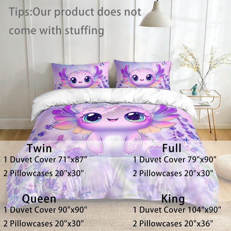 - 3-Piece Twin Duvet Cover: Includes 1 Axolotl printed Duvet Cover(71 x 87 in),2 Envelope Pillowcases(20 x 30 in),quilt and pillow not included