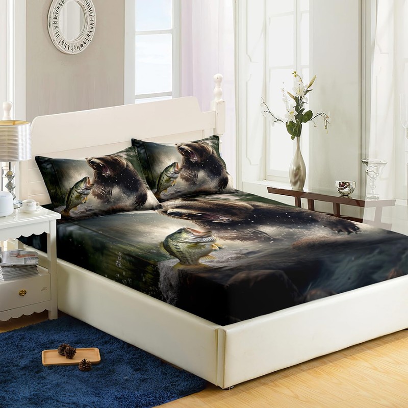 AILONEN Roaring Bear Fitted Sheet Set Full Size,Brown Animal Bear Print Bed Sheet Set,Fishing Sheet Set,Woodland Forest Wildlife Bedsheet Set 3 Pieces, 1 Fitted Sheet and 2 Pillowcases