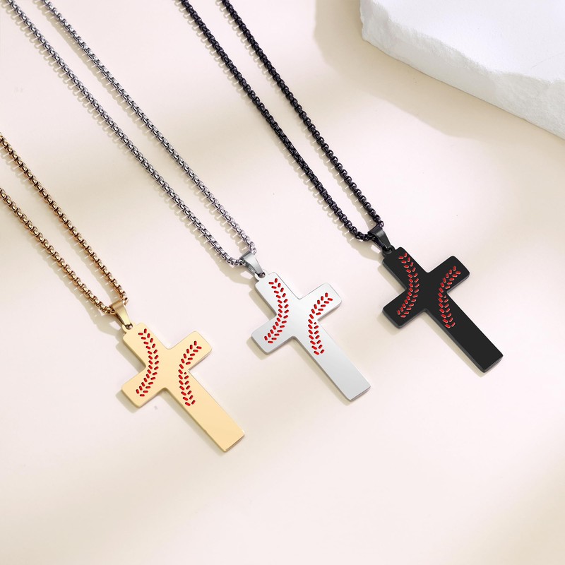 - Material: Our Black baseball cross necklace is made of 316L stainless steel, Stainless steel men's Baseball Bible Verse Cross Necklace comes in 3 colors Black/gold/Sliver. The front and back of the cross are highly polished for a shiny finish. Crafted with stainless steel, this Baseball Bible Verse Cross Necklace is long-lasting, making it an ideal gifts for men who value quality.