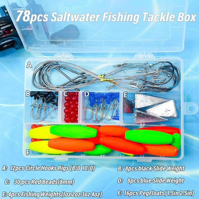 - 🎣 Complete Fishing Kit for Surf Fishing: This 78-piece set includes everything you need for saltwater surf fishing, from floats and fishing hooks to slide weights and snap swivels, ensuring you are prepared for any fishing scenario.