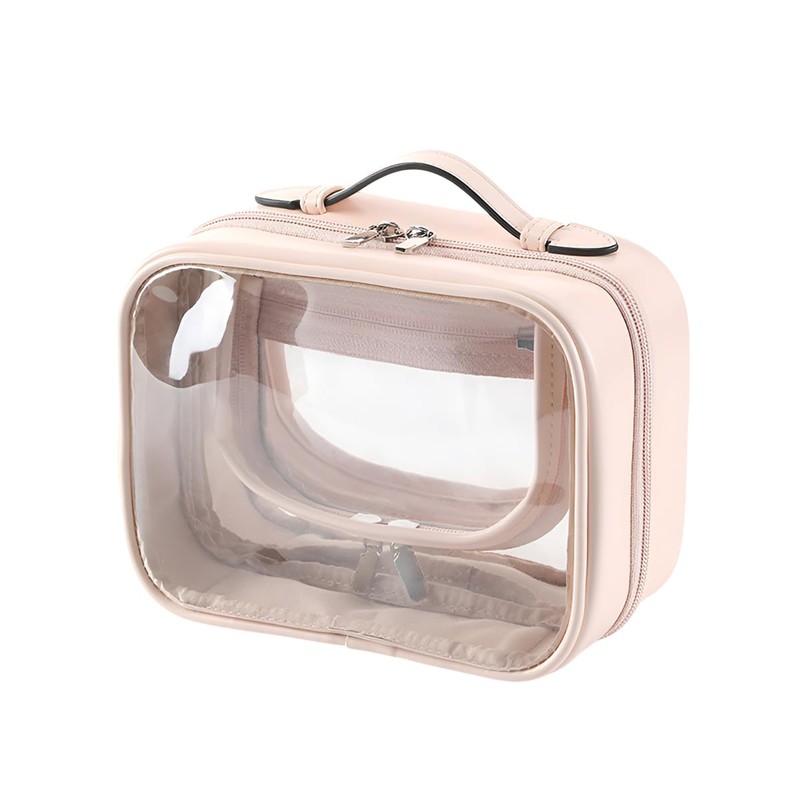 Discover the perfect travel companion with our Waterproof Travel Cosmetic Bag. Made from durable faux leather and transparent TPU, this bag offers a clear view of all your beauty essentials. With dimensions of approximately 11.8" x 5.9" x 5.1", it features two spacious compartments for organized storage, ensuring you won’t forget anything. The sturdy zippers and lightweight design make it easy to carry with the top handle, ideal for packing in your luggage or duffel bag. Whether for makeup, hair products, or toiletries, this ultra-light and stylish bag meets all your travel needs.