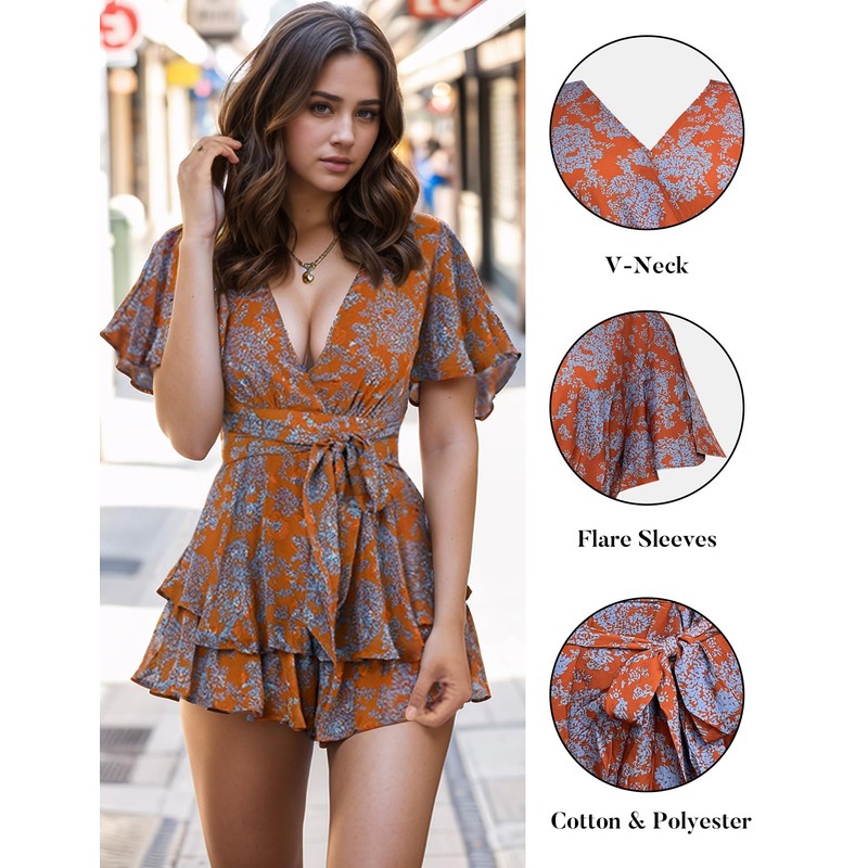 - DESIGN DETAILS: This short flare sleeve romper is very suitable for the summer. The waist tie knot design shows the body curve very well. The bow and layered ruffled hem make the rompers look more unique. The selected printed fabrics give this jumpsuits a strong vintage feature.