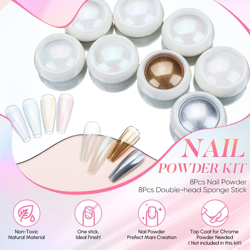 - Package includes: 6 colours pearl chrome powder + chrome nail powder gold and silver + 8 eye shadow pencils. 500+ nails can be made with 1g of nail powder per can.
