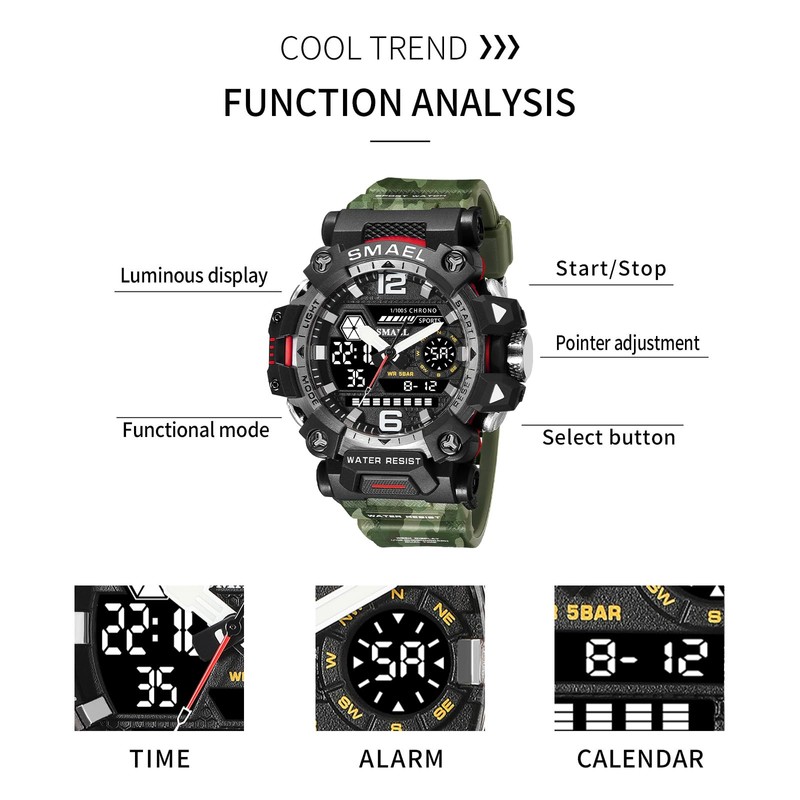 • Multi-functional Fashion Sport Watch: Analog digital dual time display, Military 12/24-hour format, Calendar(Day, date and month) , Stopwatch, Hourly chime, Alarm clock and Split time function
