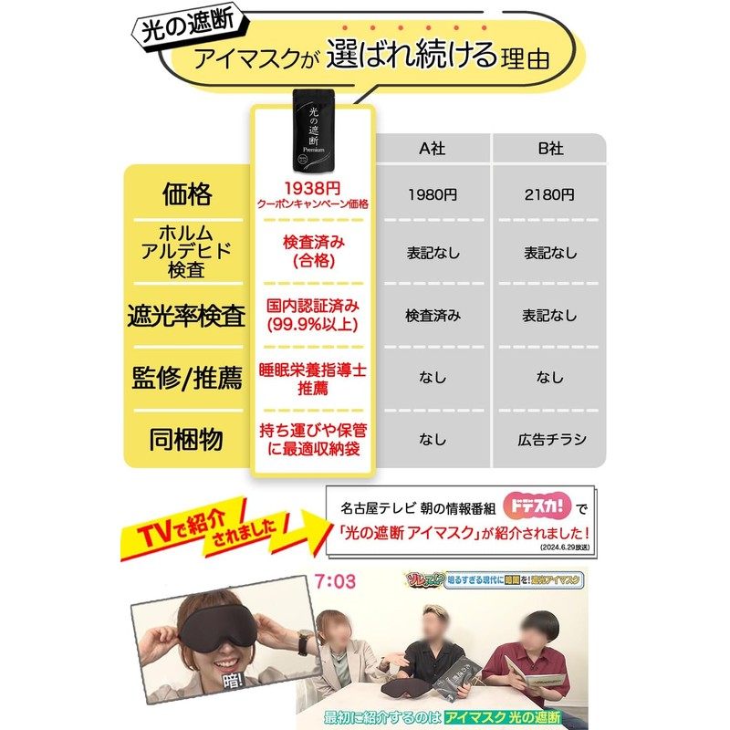 • [Domestically Certified Blocks 99.99%] The most important role of eye mask is to block light. In modern days, it becomes noticeably in dark rooms such as small light while charging or standby power supply, so it is difficult to obtain a dark environment just by turning off the electricity and even if the light is turned off, your eyes will become accustomed to the feeling of light. When choosing an eye mask, it is important to be aware of the light blocking rate