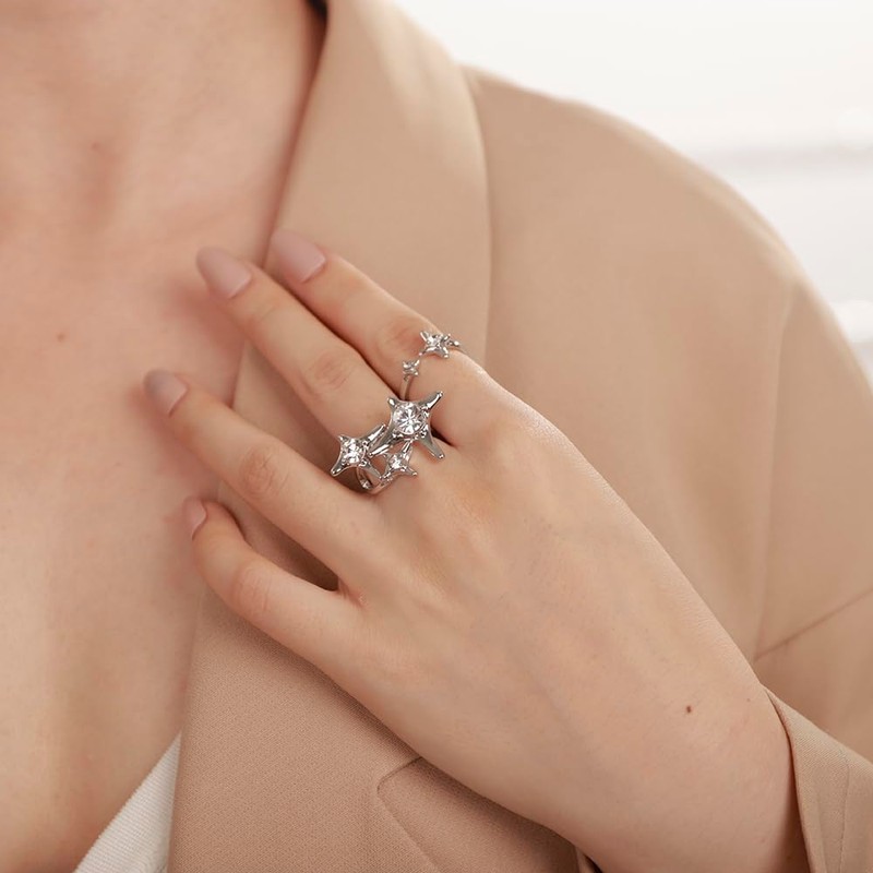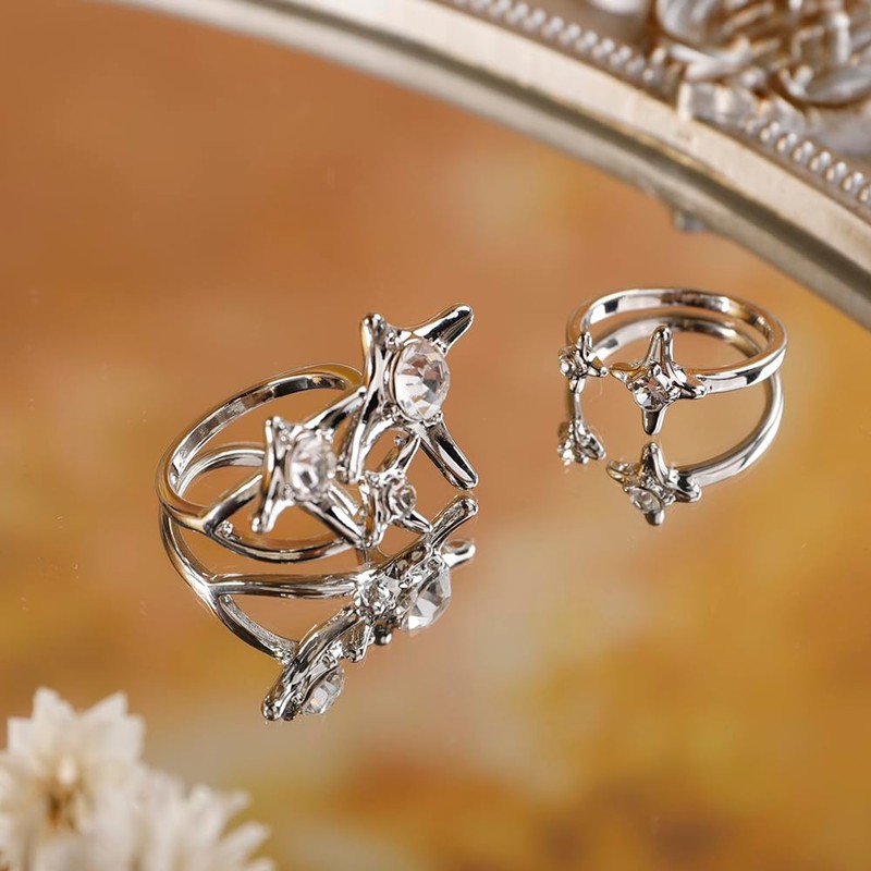Aimimier Bohemian Sparkling Crystal Star Rings Set Wrap Open Joint Knuckle Silver Star Rings Stackable Rhinestone Statement Rings for Women Girls (2 PCS)