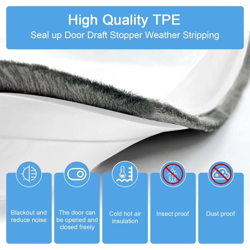 Easy to Install: This door sweep has self-adhesive super glue and an integrated brush design, Just measure the width of your door, cut to size, peel the backing off the adhesive and stick it to the door! Also preheat the strip with hairdryer in cold winter to help it stick well. The sound proof door sealer boasts unmatched water resistance and adhesion. It's very useful for light, dirt, leaves, snow, smell and animals; You needn't worry about it will fall off even in the worst storms!
