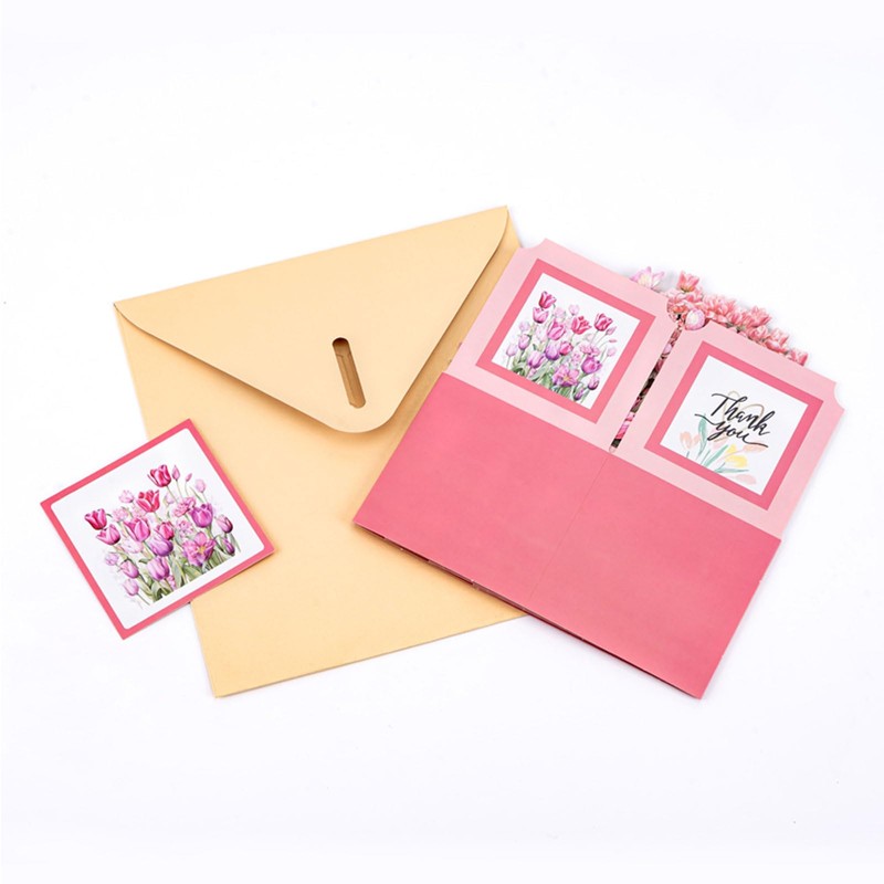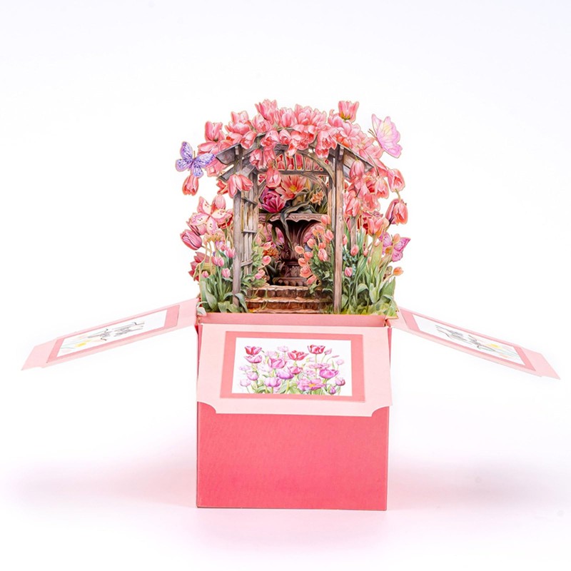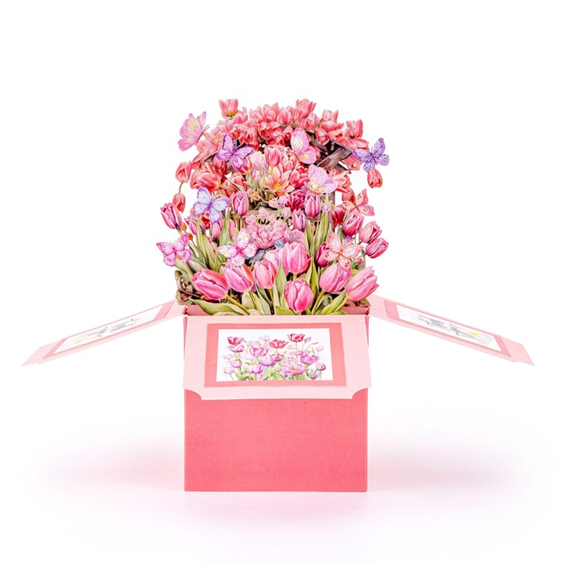 - DESIGN: Beautiful 3D pop-up card featuring pink tulips, butterflies, and delicate floral arrangements that create a stunning dimensional display when opened