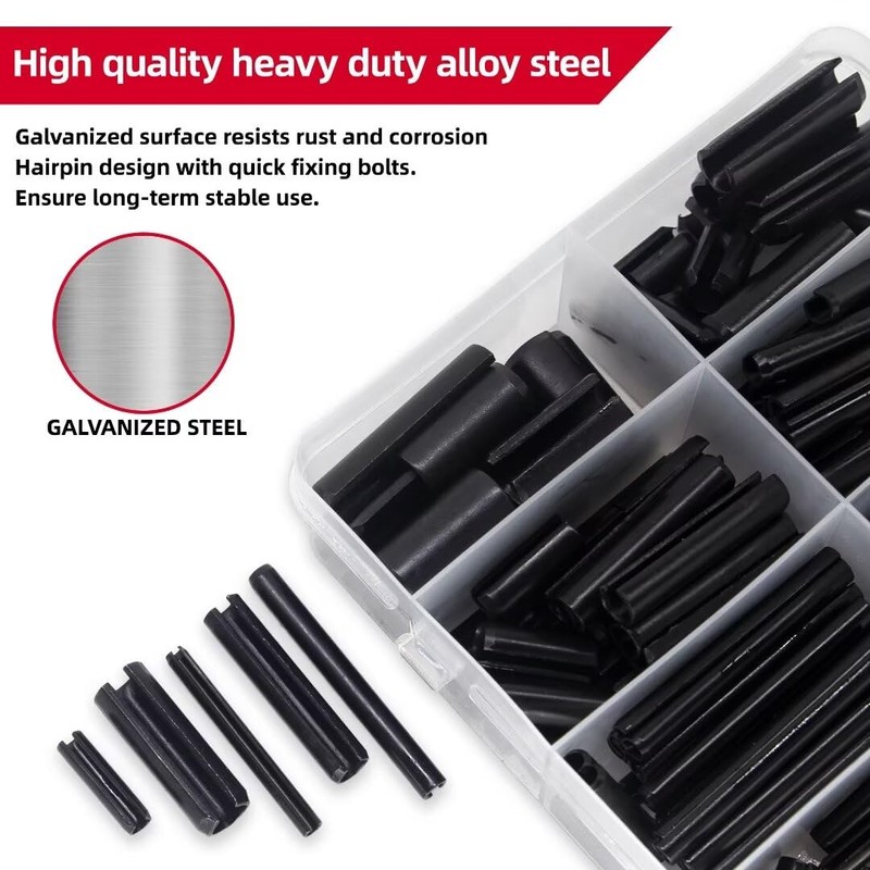• ✔【WIDE APPLICATION】: The slotted spring pin kit is useful in industrial production and home improvement, such as fixing mechanical installations, repairing electrical appliances, guns, cars, trucks and boats, etc.