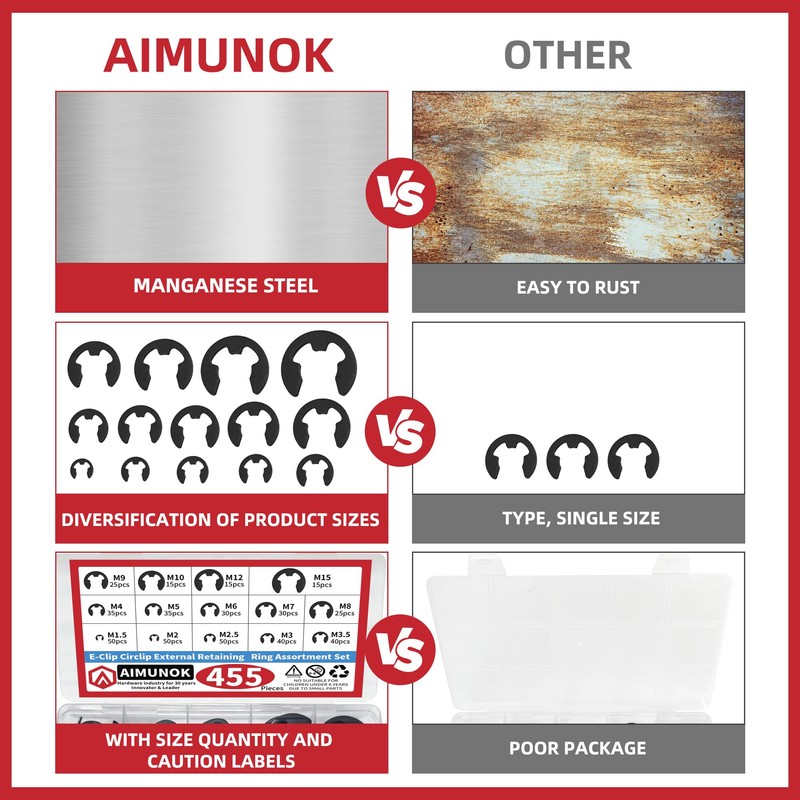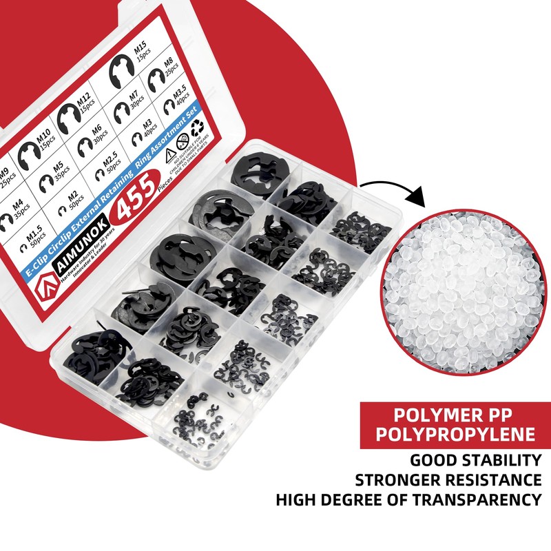 【AIMUNOK 455Pcs E-Clip External Retaining Rings Snap Rings Assortment Set, High Carbon Steel C-Clip Kit, 14 SAE Sizes Circlip Snap Rings M1.5- M15】