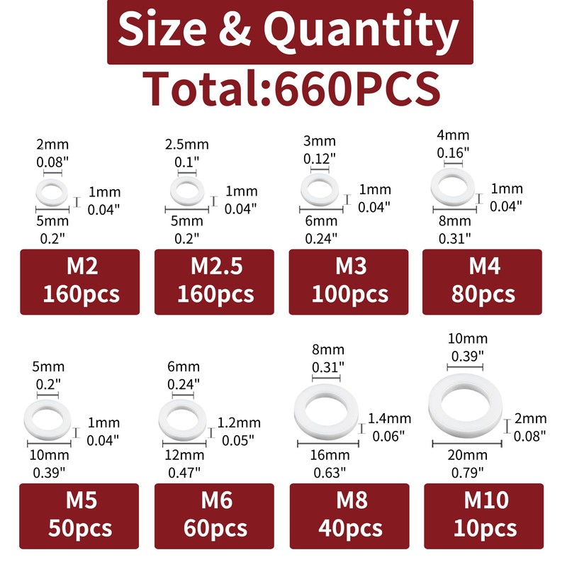 - 【Dimension】-✨ 660 pieces white nylon washers, nylon metric washers, nylon flat washers, M2 M2.5 M3 M4 M5 M6 M8 M10, total 8 different sizes, different sizes and enough quantities can meet your different daily needs.