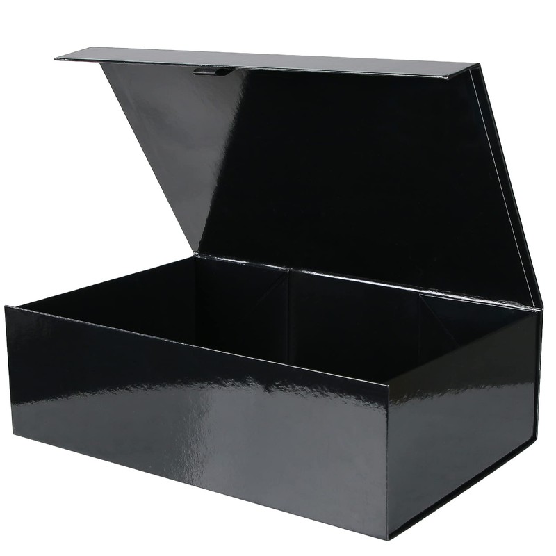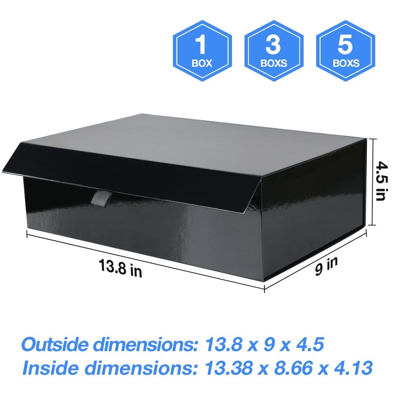 - Black Gift Boxes - boxes are shipped flat; large black collapsible gift box with magnetic closure, assembled box outside dimensions 13.8 x 9 x 4.3 inch, inside dimension 12.5 x 8.66 x 4.13 inch.