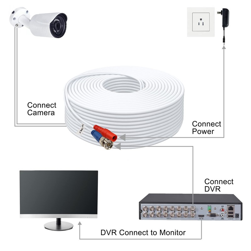 • Package Included:1 Piece 200 Feet BNC Video and Power Security Camera Cable,1 Piece BNC to BNC Female Connector,1 Piece BNC Female to RCA Male Connector,100 Pieces Cable Clips.