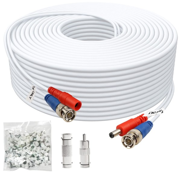 Aimyzii BNC Cable 200ft 1 Pack BNC Video Power Cable,Security Camera Cable for CCTV Camera DVR Security Systems(Included 2X BNC Adapters,100 Pcs Cable Clips)-White